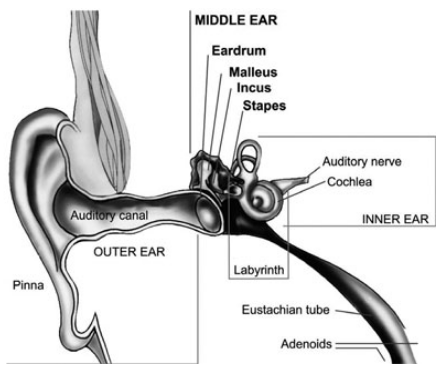 An ear infection is the inflammation of the outer, middle or inner ear. For this article, I am going to focus on the most common type, known as Otitis Media (OM) or middle ear infection. Most often times these infections occur between the eardrum and inner ear- known as the middle ear. The purpose of the middle ear is to transmit sound, or vibrational waves from the outer ear to the inner ear to produce sound. These ear infections are caused by a viral or bacterial infection. Bacterial ear infections are most likely caused by the bacteria Streptococcus pneumoniae. Viruses can be the culprit of middle ear infections as well. Viruses, such as the common cold or allergies can cause a build-up of fluid and the development of pressure in the eustachian tube, which connects the middle ear to the throat. This build-up of pressure and fluid then create an environment for the growth of bacteria or virus to thrive on, resulting in an ear infection.